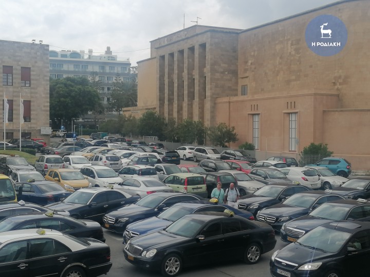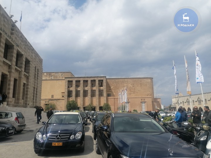 Δεκάδες ιδιοκτήτες και οδηγοί ταξί είναι αυτή την ώρα συγκεντρωμένοι στην πλατεία Δημαρχείου, έχοντας παρατάξει πάνω από διακόσια ταξί (σ.σ. χωρίς να παρεμποδίζουν την κυκλοφορία), την ίδια στιγμή που οι εκπρόσωποί τους βρίσκονται στην Τροχαία Ρόδου, συνοδευόμενοι από τους δικηγόρους τους, για να κάνουν την καταγγελία τους αλλά και να υποβάλουν μηνύσεις για να εφαρμοστεί ο νόμος, όπως λένε. Συγκεκριμένα, στο Τμήμα Τροχαίας μετέβησαν ο Πρόεδρος του Συνδέσμου Ιδιοκτητών ταξί Ρόδου κ. Θεοδόσης Καστανίδης, ο Πρόεδρος του Συνεταιρισμού Ραδιοταξί «Ρόδος», κ. Σάββας Χατζηγεωργίου καθώς και ο Πρόεδρος του Ράδιο ταξί «Διαγόρας», συνοδευόμενοι από τους δικηγόρους τους, κα Ασημένη Βεργή και κ. Κώστα Χαλκιά. Σημειώνεται ότι στην Τροχαία ήταν και ο Αντιπεριφερειάρχης κ. Χρήστος Ευστρατίου, λόγω της αρμοδιότητας που έχει για τις συγκοινωνίες.