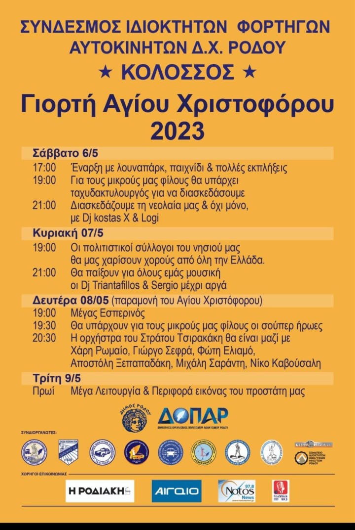 Τον Άγιο Χριστόφορο, προστάτη των οδηγών, τιμού φέτος με εορταστικές εκδηλώσεις από τις 6 έως τις 9 Μαΐου οι: Δήμος Ρόδου, ΔΟΠΑΡ, Σύνδεσμος Ιδιοκτητών Ταξί, Σωματείο Ιδιοκτητών Λεωφορείων, Σωματείο Χωματουργών, Σύλλογος Εκπαιδευτών οδηγών Δωδεκανήσου, Συνδικάτο εργαζομένων ΡΟΔΑ, ΚΤΕΛ Ρόδου, Σωματείο Οδηγών Τουριστικών λεωφορείων, Σωματείο Οδηγών Ταξί, Ενωση Κοσκινιατών Διγενής Α.Σ.