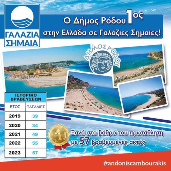 Την ικανοποίησή του για το γεγονός ότι φέτος στο νησί της Ρόδου θα κυματίζουν 57 «Γαλάζιες Σημαίες» σε ισάριθμες παραλίες (περισσότερες από κάθε άλλη χρονιά) και για το γεγονός ότι σε επίπεδο δήμων, ο δήμος Ρόδου έχει την πρωτιά στη χώρα, εκφράζει ο δήμαρχος Ρόδου κ. Αντώνης Καμπουράκης.