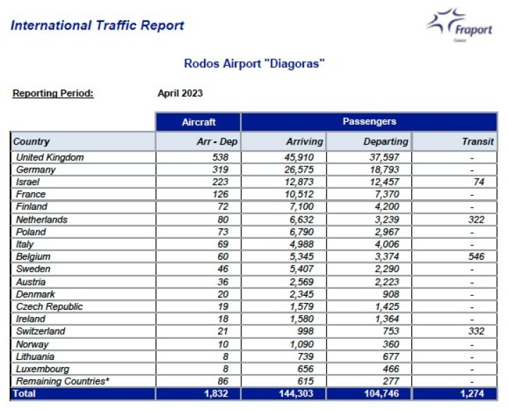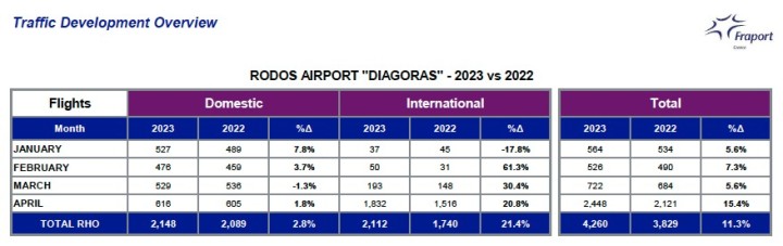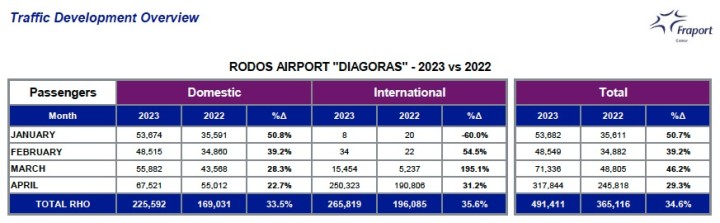 Σε ό,τι αφορά το μηνιαίο απολογισμό για τη διακίνηση των τουριστών μέσω του αεροδρομίου της Ρόδου, αποτυπώνεται και εκεί διψήφια αύξηση καθώς σύμφωνα με τα στοιχεία διακινήθηκαν 250.323 επιβάτες έναντι 190.806 τον Απρίλιο του 2022 με το ποσοστό να φτάνει το 31,2%.