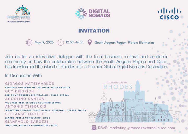 Η εκδήλωση θα λάβει χώρα στο κτήριο της Περιφέρειας και θα έχει ως θέμα το πώς η συνεργασία της Περιφέρειας Νοτίου Αιγαίου με τη Cisco έχει μετασχηματίσει τη Ρόδο σε παγκόσμιο προορισμό ψηφιακών νομάδων.