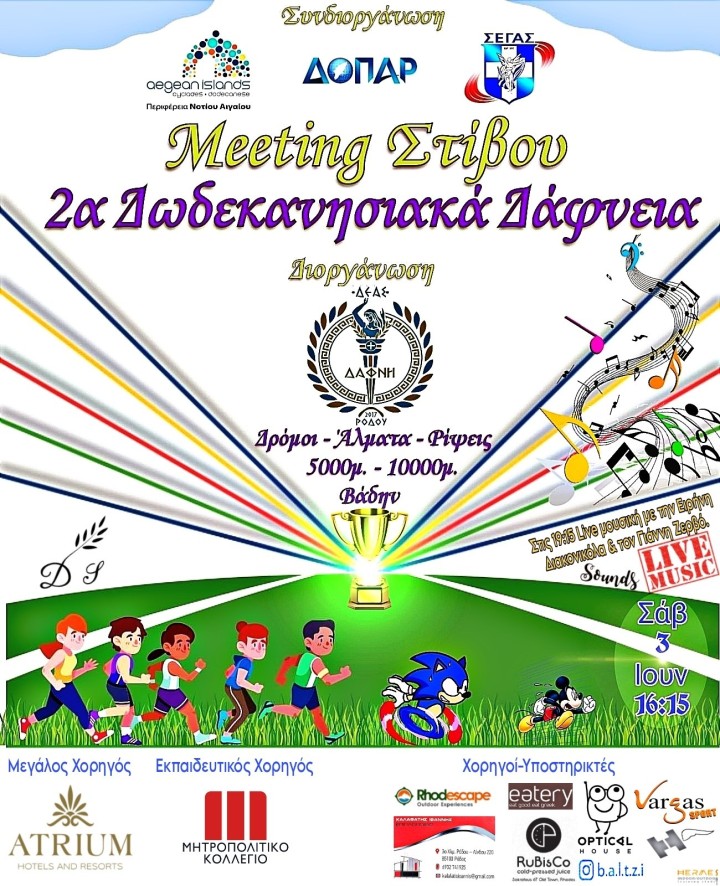 Μέχρι την ερχόμενη Τρίτη θα μπορεί ο κάθε ενδιαφερόμενος αθλητής με δελτίο ΣΕΓΑΣ ή ελεύθερος ασκούμενος να δηλώσει συμμετοχή στα «2α Δωδεκανησιακά Δάφνεια» που διοργανώνει η Δάφνη Ρόδου με την Περιφέρεια Νοτίου Αιγαίου και τον ΔΟΠΑΡ, έχοντας τη στήριξη από την ΕΑΣ Δωδεκανήσου, τον Σύνδεσμο Κριτών Στίβου Δωδεκανήσου, αλλά κι αρκετούς χορηγούς.