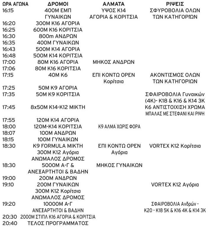 80μ. - 600μ. – Σφαιροβολία 3κ. – Επί κοντώ - Δισκοβολία μαζί με Γυν. – Σφυροβολία 3κ. – Ακοντισμός 500γρ.