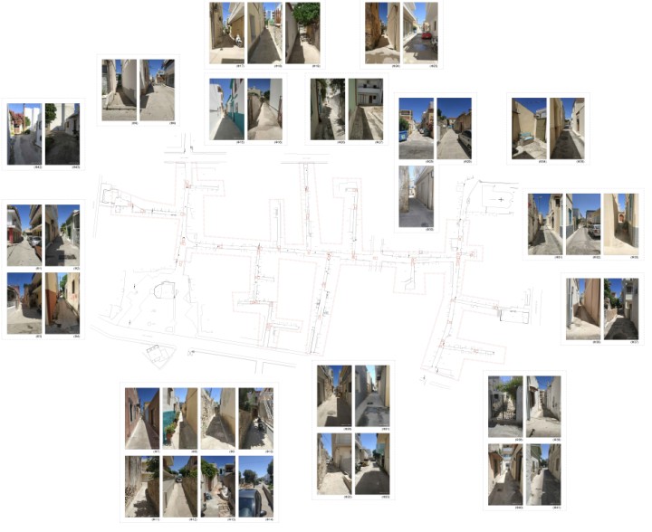 Στα σημεία όπου διασταυρώνονται οι πεζοδρόμοι δημιουργούνται πλατώματα που επιστρώνονται με βότσαλα σύμφωνα με την παραδοσιακή τεχνική του βοτσαλωτού.