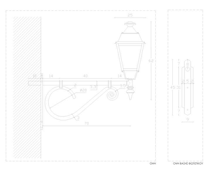 Ο λειτουργικός φωτισμός των πεζόδρομων επιτυγχάνεται με την τοποθέτηση επιτοίχιων φωτιστικών σωμάτων από χυτοσίδηρο με γενική διάσταση 70x78 εκ.
