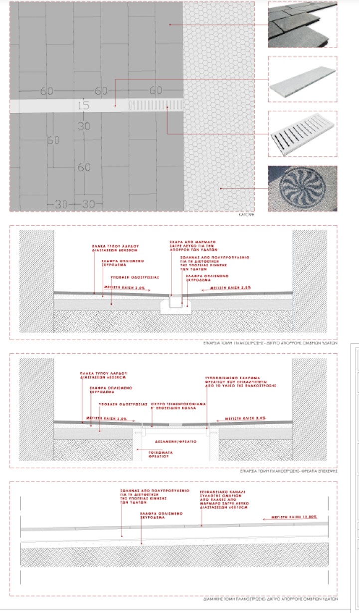 Οι πλάκες τοποθετούνται με μέγιστη κλίση 2% προς τον κεντρικό άξονα του κάθε πεζόδρομου όπου θα κατασκευαστεί επιφανειακό κεντρικό κανάλι συλλογής των όμβριων υδάτων με ορθογωνισμένες πλάκες από μάρμαρο σαγρέ λευκό διαστάσεων 60x15 εκ. Ανά διαστήματα το κανάλι θα φέρει σχάρες διαστάσεων 60x15 εκ., για την απορροή των όμβριων υδάτων προς τους κεντρικούς υπόγειους αγωγούς, κατασκευασμένες επίσης από μάρμαρο σαγρέ λευκό.