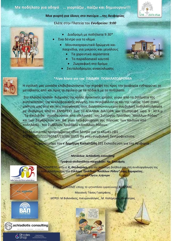 «Η σχολική μας μονάδα, επιβεβαιώνοντας τη στροφή της προς την αειφορία, ενθαρρύνει τη μετάβαση από και προς το σχολείο με τα πόδια ή με το ποδήλατο. Στο πλαίσιο λοιπόν διάχυσης της καλής πρακτικής χρήσης γύρω από τα ζητήματα της κινητικότητας, της κυκλοφοριακής αγωγής, του περιβάλλοντος και της υγείας τόσο στους μαθητές μας όσο και στις οικογένειες τους, διοργανώνουμε μία συμβολική ποδηλατοδρομία με διαδρομή από το Ενυδρείο έως το άγαλμα του Διαγόρα και επιστροφή ώρα 9:30 π.μ .