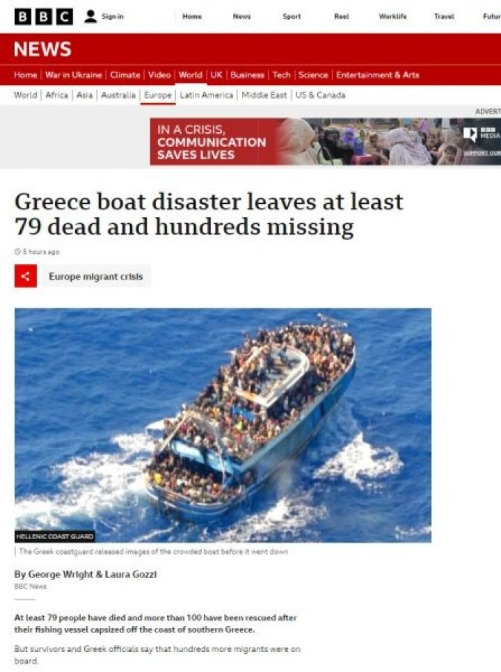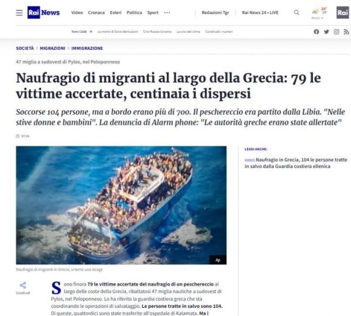 «Ναυάγιο μεταναστών στα ανοικτά της Ελλάδας: 79 οι επιβεβαιωμένοι νεκροί, εκατοντάδες αγνοούμενοι», είναι ο τίτλος στο site του Rai. Όπως αναφέρει η ιταλική δημόσια ραδιοτηλεόραση, «Διασώθηκαν 104 άτομα. Από αυτούς, τα 14 έχουν μεταφερθεί στο νοσοκομείο της Καλαμάτας όμως εκατοντάδες αγνοούνται, καθώς στο σκάφος επέβαιναν πιθανότατα περισσότεροι από 700 μετανάστες. Το αλιευτικό είχε αναχωρήσει από τη Λιβύη και είχε γυναίκες και παιδιά στα αμπάρια».