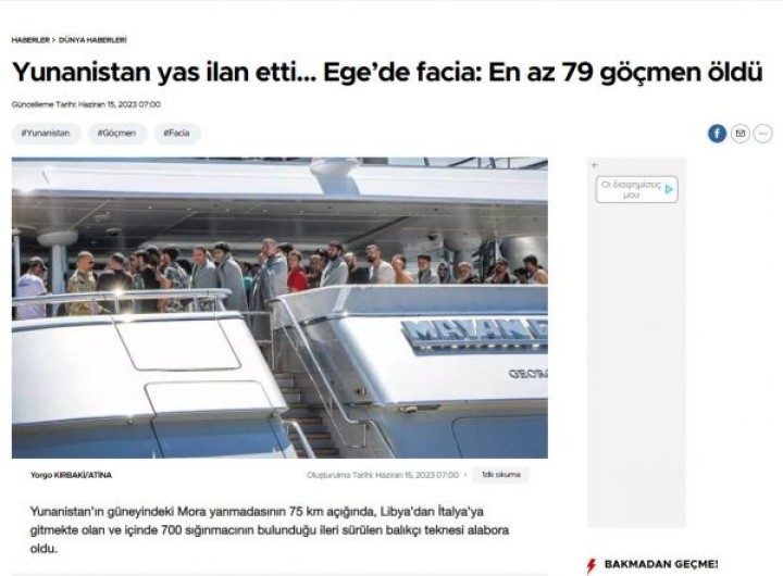«Η Ελλάδα κήρυξε πένθος… Καταστροφή στο Αιγαίο: Τουλάχιστον 79 μετανάστες πνίγηκαν», τιτλοφορείται άρθρο στην τουρκική Hurriyet, η οποία δημοσιεύει την ανακοίνωση του Λιμενικού Σώματος.