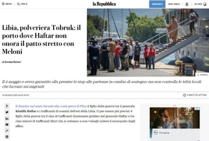 Σε άλλο άρθρο, το οποίο υπογράφει ο δημοσιογράφος Daniele Raineri, αναφέρεται πως το πλοίο «είχε αναχωρήσει από το Τομπρούκ της Λιβύης με προορισμό την Ιταλία» και υπογραμμίζεται πως πρόκειται για το λιμάνι, όπου ο Χαφτάρ δεν τηρεί τη συμφωνία που έχει συνάψει με την Μελόνι. «Στις 4 Μαΐου είχε εγγυηθεί στην πρωθυπουργό τη διακοπή των αναχωρήσεων από το Τομπρούκ με αντάλλαγμα την υποστήριξη. Ωστόσο, δεν ελέγχει τις τοπικές φυλές που εκμεταλλεύονται τους μετανάστες», υπενθυμίζεται.