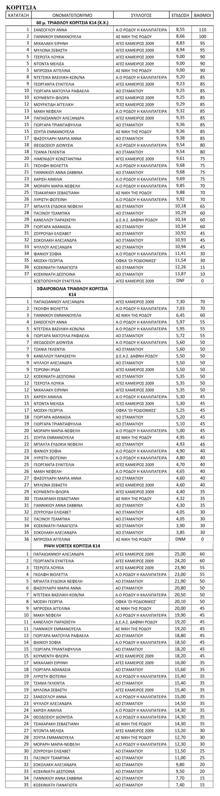 Στα κορίτσια πρώτευσε ο ΑΟ Καλλιπάτειρα με 1485 βαθμούς, αφήνοντας 2ο τον ΑΟ Σταματίου με 1470 και 3ο τον ΑΓΕΣ Κάμειρος 2009 με 1275.