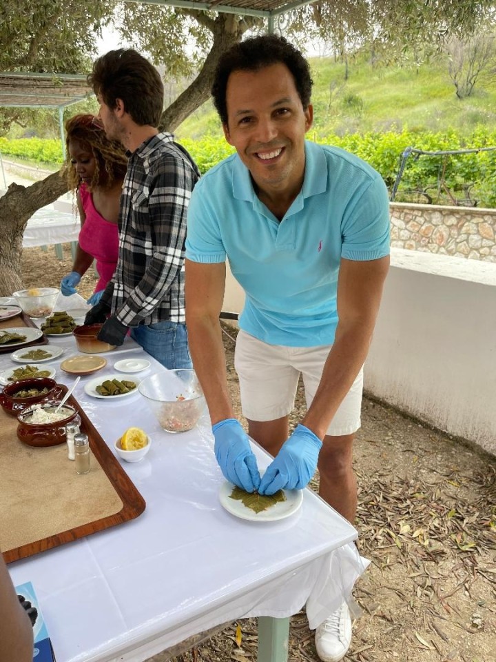 Περιηγήθηκε στ’ Απόλλωνα όπου θαύμασε τον παραδοσιακό τρόπο ζωής και παραγωγής προϊόντων της ροδίτικης γης, πήγε στο οινοποιείο Τριανταφύλλου στον Καλαμώνα, παρακολούθησε μαθήματα μαγειρικής όπου βοήθησε και έμαθε να φτιάχνει ντολμαδάκια! Δεν παρέλειψε φυσικά να δοκιμάσει τις ποικιλίες των ροδίτικων κρασιών!