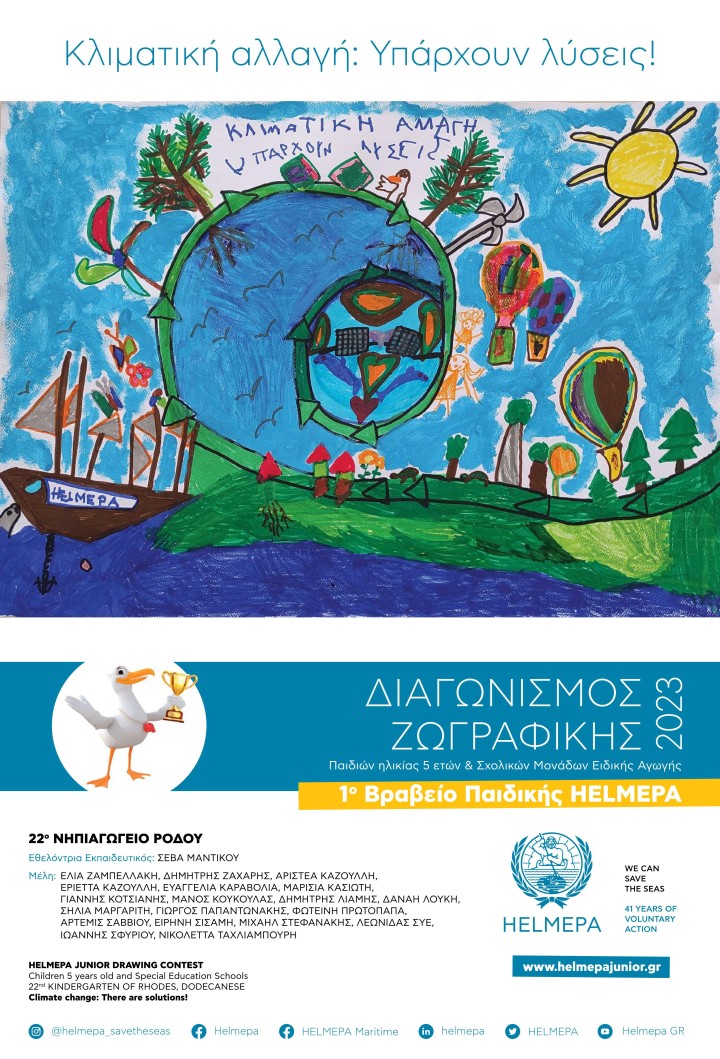 Ένα από τα έργα που βραβεύτηκαν στην 1η κατηγορία: Νηπιαγωγεία και Σχολικές Μονάδες Ειδικής Αγωγής με Α’ ΒΡΑΒΕΙΟ είναι και το 22ο Νηπιαγωγείο Ρόδου με υπεύθυνη εκπαιδευτικό την Σέβα Μαντικού και την συνεργάτριά της Γεωργία Λιάτσου και το έργο των παιδιών θα αποτελέσει μια από τις κεντρικές αφίσες της HELMEPA για την ευαισθητοποίηση του ευρύτερου κοινού και θα είναι διαθέσιμες για το σχολικό έτος 2023-2024, σε όλα τα σχολεία της χώρας, μέσω του πανελλήνιου δικτύου της παιδικής HELMEPA ,μεταφέροντας τα αισιόδοξα μηνύματα των παιδιών-μελών της για την αντιμετώπιση της κλιματικής αλλαγής.
