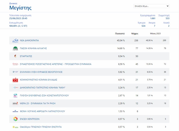 Τα τελικά αποτελέσματα των εκλογών στη Μεγίστη