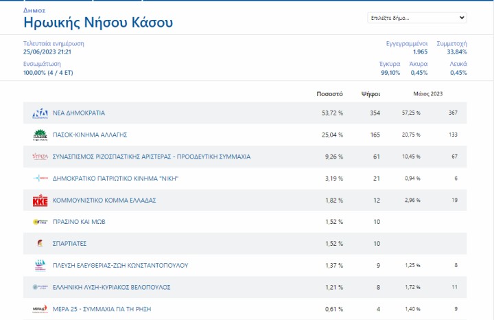 Τα τελικά αποτελέσματα των εκλογών για το νησί της Κάσου έχουν ως εξής: