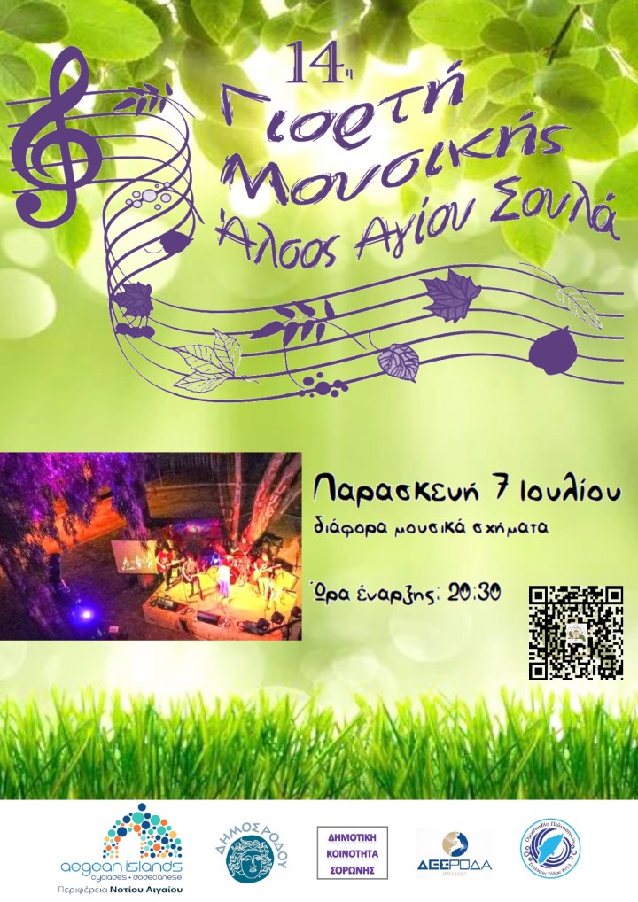 Για 14η χρονιά, ο Πολιτιστικός και Λαογραφικός Σύλλογος Σορωνής Ρόδου «Το Αμπερνάλλι» διοργανώνει και σας προσκαλεί στη Γιορτή Μουσικής, στο Άλσος Αγίου Σουλά, την Παρασκευή 7 Ιουλίου 2023, στις 20:30!