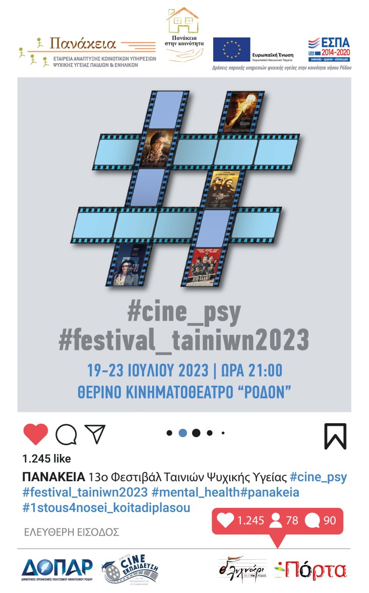 H Εταιρεία Ανάπτυξης Κοινοτικών Υπηρεσιών Ψυχικής Υγείας Παιδιών και Ενηλίκων «Πανάκεια» διοργανώνει το 13ο Φεστιβάλ Ταινιών Ψυχικής Υγείας από τις 19 Ιουλίου έως και τις 23 Ιουλίου 2023 στο Θερινό Κινηματοθέατρο Ρόδον, με στόχο την ευαισθητοποίηση και ενημέρωση της κοινότητας σε θέματα ψυχικής υγείας και άνοιας.