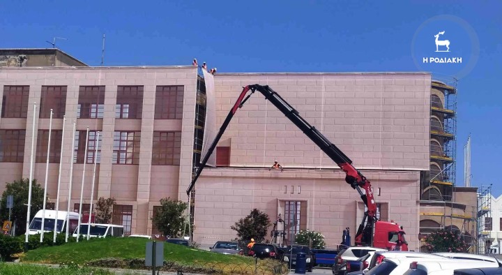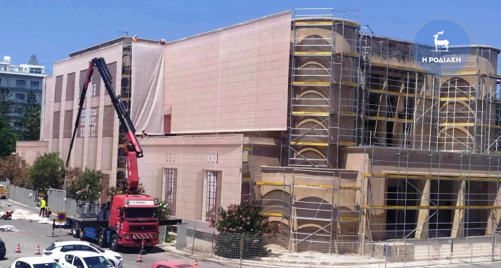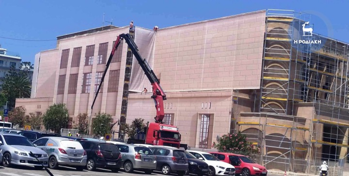 Με γοργούς ρυθμούς προχωρούν οι εργασίες για την αποκατάσταση και επαναλειτουργία του Εθνικού Θεάτρου της Ρόδου και μάλιστα χτες συνεργείο τοποθέτησε στις ειδικές σκαλωσιές εξωτερικά του κτηρίου το ειδικό πανό το οποίο αποτυπώνει την όψη του θεάτρου όταν το έργο θα έχει ολοκληρωθεί.