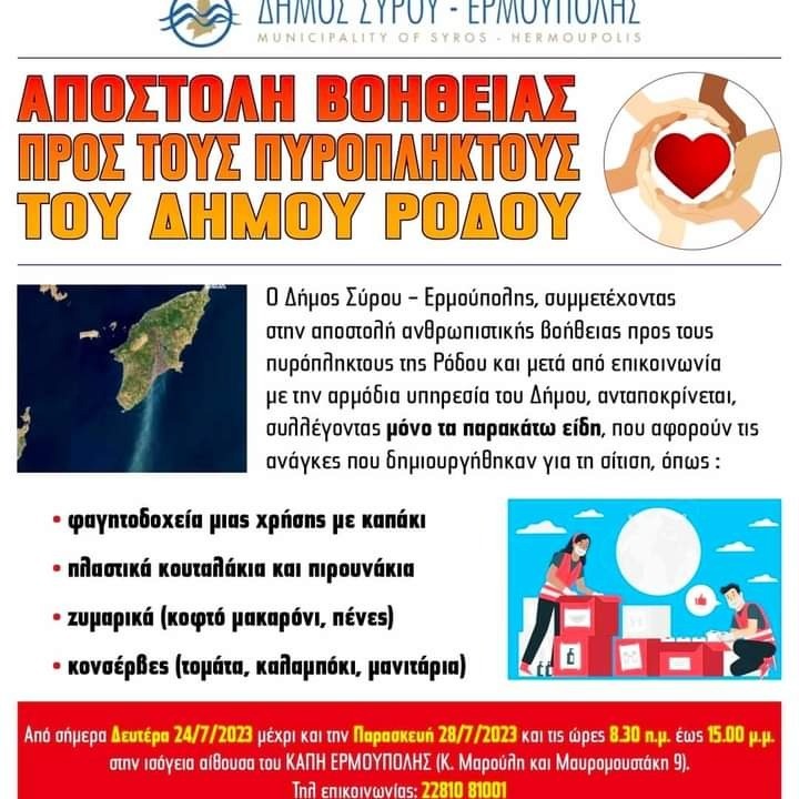 Με πρωτοβουλία του Δημάρχου Σύρου- Ερμούπολης κ. Νικόλαου Λειβαδάρα και με τη βοήθεια της Αντιδημάρχου Καθαριότητας, Ανακύκλωσης, Περιβάλλοντος και Κοινωνικής Προστασίας Δήμου Σύρου – Ερμούπολης κ. Αγγελικής Πρίντεζη, οι κάτοικοι της Σύρου συγκέντρωσαν 50 κούτες ανθρωπιστικής βοήθειας, μέσω της κοινωνικής υπηρεσίας, και τις απέστειλαν στη Δομή Παροχής Συσσιτίου του Δημοτικού Οργανισμού Πρόνοιας Ρόδου για την κάλυψη των αναγκών των πληγέντων από την πολυήμερη καταστροφική πυρκαγιά.