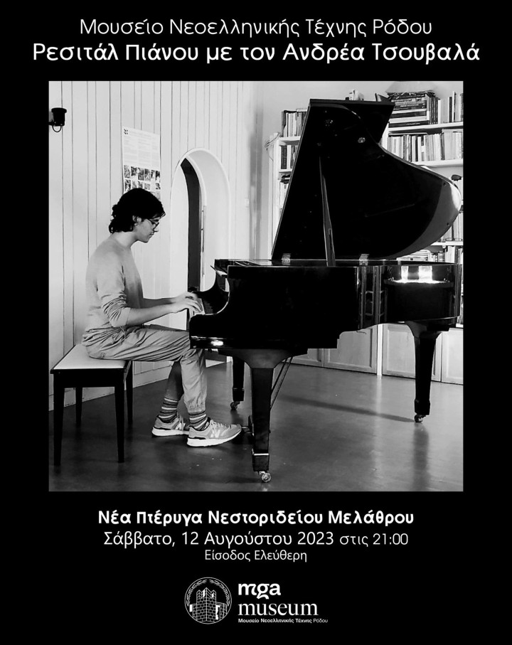 Το Μουσείο Νεοελληνικής Τέχνης Ρόδου στο πλαίσιο της έκθεσης γλυπτικής και ζωγραφικής του Γιώργου Ζογγολόπουλου «Τα έργα ηχούν σαν μουσική», διοργανώνει το Σάββατο 12 Αυγούστου στις 21:00 ρεσιτάλ πιάνου με τον νέο πιανίστα Ανδρέα Τσουβαλά.