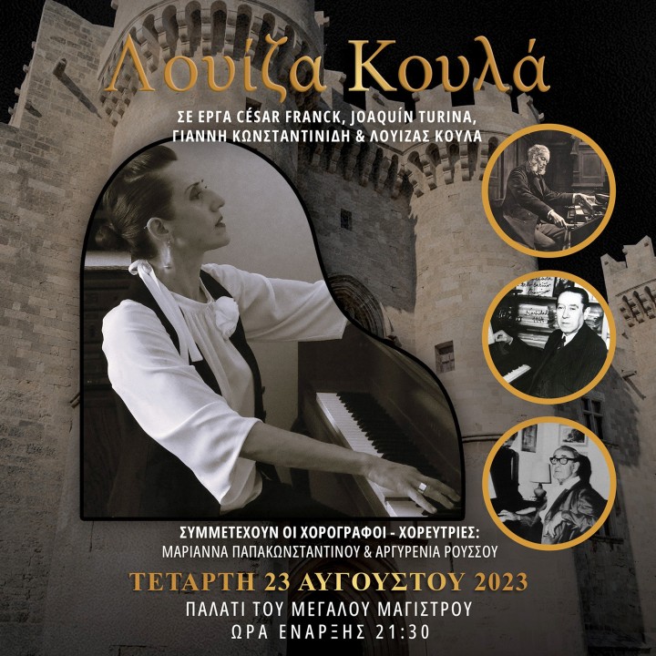 Ο Δημοτικός Οργανισμός Πολιτισμού – Αθλητισμού Ρόδου (ΔΟΠΑΡ) παρουσιάζει ρεσιτάλ πιάνου με τη Λουίζα Κουλά, σε έργα Φρανκ, Τουρίνα, Κωνσταντινίδη και σε πρώτη εκτέλεση τη σουίτα της ίδιας για πιάνο και σκηνική δράση με τίτλο «Έξι εικόνες για τον ήρωα Μίχαλο Ρούση».