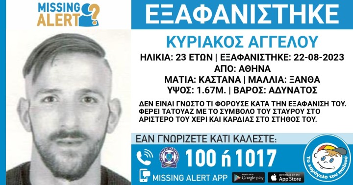 Όπως αναφέρει η ανακοίνωση που εξέδωσε το «Χαμόγελο του Παιδιού», ο οργανισμός «ενημερώθηκε στις 23 Αυγούστου 2023 για την εξαφάνιση του Κυριάκου Αγγέλου και προχώρησε στη δημοσιοποίηση των στοιχείων του ενήλικα κατόπιν αιτήματος της οικογένειάς του, καθώς συντρέχουν σοβαροί λόγοι, οι οποίοι θέτουν τη ζωή του σε κίνδυνο.
