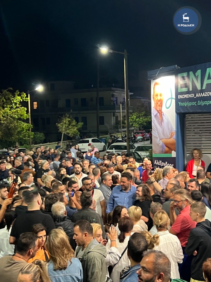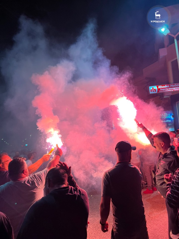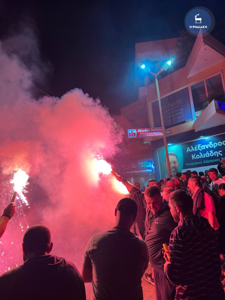 Συνεχίζονται με ακόμη μεγαλύτερη θέρμη οι πανηγυρισμοί έξω από το εκλογικό κέντρο του νέου δημάρχου κ. Αλέξανδρου Κολιάδη.
