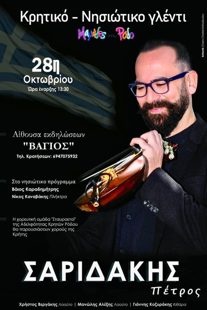 Τη διασκέδασή μας στο κρητικό πρόγραμμα θα αναλάβει ο συνθέτης, μουσικός και ερμηνευτής Πέτρος Σαριδάκης, τον οποίο θα πλαισιώνουν οι Χρήστος Βεργάκης και Μανώλης Αλέξης στο λάουτο και ο Γιάννης Κοζυράκης στην κιθάρα.