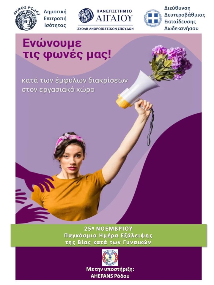 Μια ξεχωριστή Εσπερίδα διοργανώνουν η Επιτροπή Ισότητας του Δήμου Ρόδου με τη Σχολή Ανθρωπιστικών Επιστημών του Πανεπιστημίου Αιγαίου και τη Διεύθυνση Δευτεροβάθμιας Εκπαίδευσης Δωδεκανήσου με την υποστήριξη της AHEPANS Ρόδου για τις έμφυλες διακρίσεις στον εργασιακό χώρο με αφορμή την Παγκόσμια Ημέρα εξάλειψης της βίας κατά των Γυναικών.