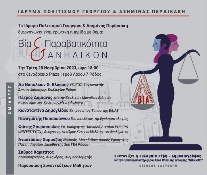 Το Ίδρυμα Πολιτισμού Γεωργίου και Ασημίνας Περδικάκη διοργανώνει ενημερωτική ημερίδα με θέμα «Βία & Παραβατικότητα Ανηλίκων», την Τρίτη 28 Νοεμβρίου και ώρα 18:00 στο ξενοδοχείο Plaza, Ιερού Λόχου 7.