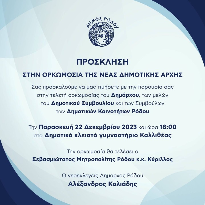 Την Παρασκευή 22 Δεκεμβρίου 2023 θα πραγματοποιηθεί στο κλειστό γυμναστήριο της Καλλιθέας η ορκωμοσία της νέας δημοτικής αρχής της Ρόδου όπως ανακοινώθηκε και επίσημα σήμερα. Η ορκωμοσία θα τελεστεί χοροστατούντος του Σεβασμιοτάτου Μητροπολίτη Ρόδου κ.κ. Κυρίλλου