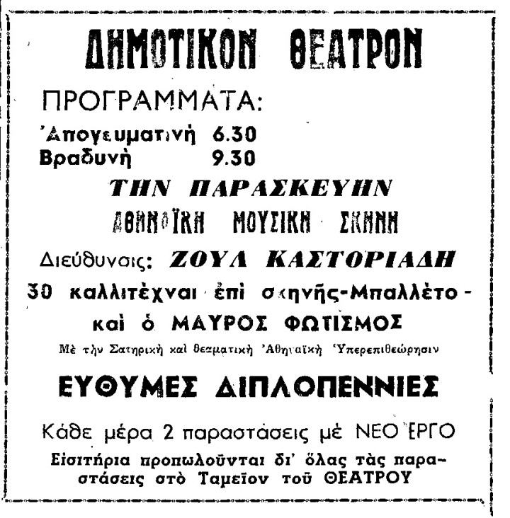Από την Παρασκευήν αρχίζει τας παραστάσεις του εις το Δημοτικόν Θέατρον Ρόδου Επιθεωρησιακός θίασος με επικεφαλής τας Μαίρη Βασιλάκη και Χάριν Παρασυράκη. Του θιάσου μετέχουν αι Μαρία Ζέλου, Άννα Σαρρή, Ντόρα Βος, Τόνια Φιλίππου και Μαρία Σίλλη, το 5μελές μπαλέττο Γιώργου Νιρβάνα και οι Νίκος Συρράκος, Μήτσος Μαλλίδης, Σπύρος Νικήτας, Ηλίας Φιλίππου, Νίκος Λώρης και Γιώργος Γιαννούλης.