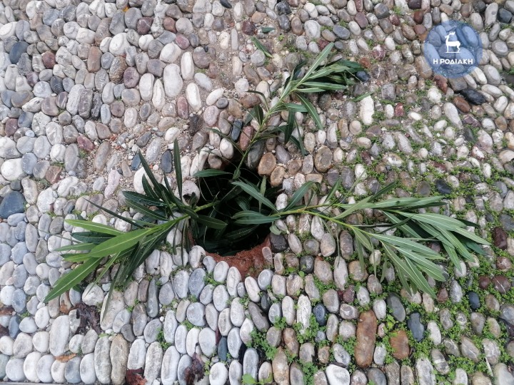 Εκεί, όμως, που... πρωτοτυπεί είναι ότι ελλείψει υλικών –μιας και είπαμε ότι πρόκειται για την οδό Ιπποτών-ή προσωπικού ή χρόνου, δεν γνωρίζουμε να σας πούμε, καλύφθηκε με... ευφάνταστο τρόπο: με πρασινάδα ή κάτι σε φυτό τέλος πάντων το οποίο... αντί σήμανσης ειδοποιεί τον διερχόμενο (πεζό ή οδηγό) για τον πιθανό κίνδυνο να μην τη δει με ό,τι αυτό συνεπάγεται.