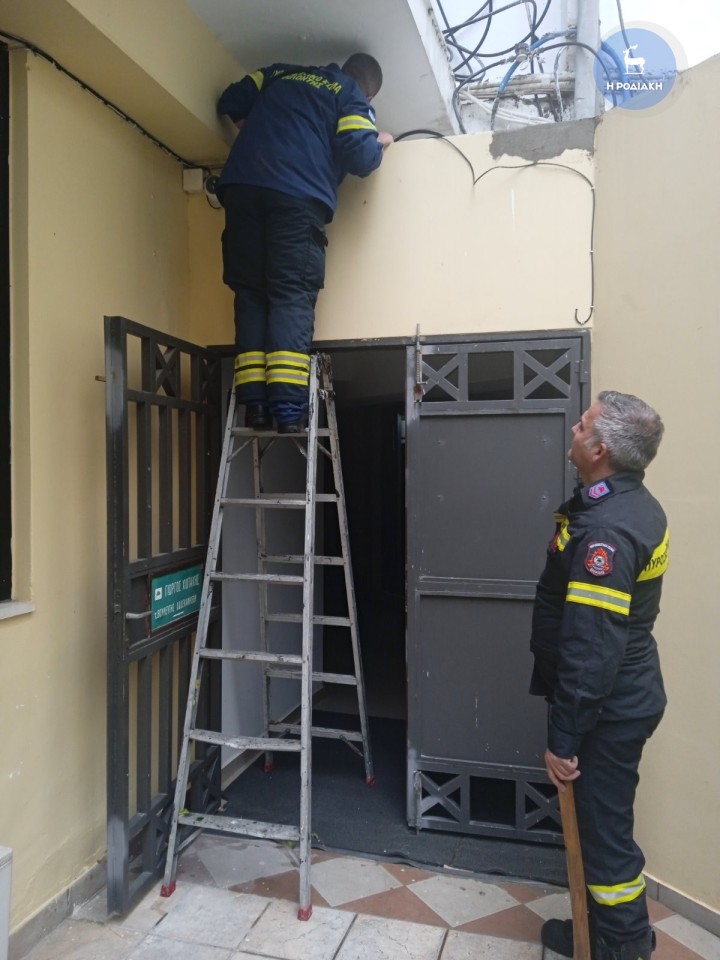 Μία γάτα που εγκλωβίστηκε σε κτήριο στην πόλη της Ρόδου απελευθέρωσαν δύο πυροσβέστες