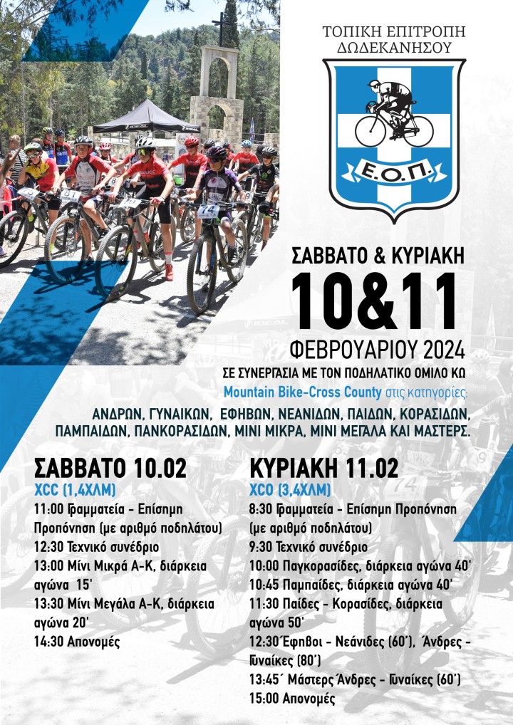 Η Τ.Ε. Ε.Ο.Π. Δωδεκανήσου σε συνεργασία με τον Ποδηλατικό Όμιλο Κω διοργανώνει το Περιφερειακό Πρωτάθλημα Ορεινής Ποδηλασίας στο αγώνισμα του CROSS COUNTRY σε σιρκουί (XCC) και XCO στην Κω, το Σάββατο και την Κυριακή 10 και 11 Φεβρουάριου.
