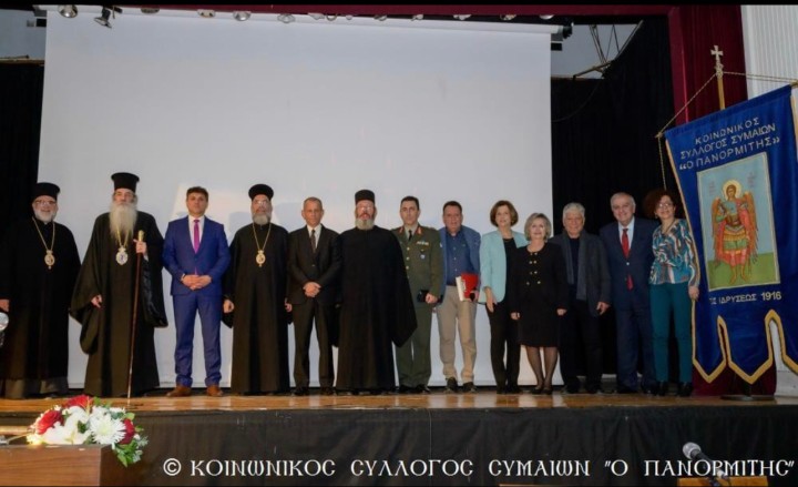 Αρχικά, παρακολούθησε την παρουσίαση τού επετειακού τόμου για τη συμπλήρωση των εκατό χρόνων από την ίδρυση του Πανορμίτειου Γυμνασίου Σύμης. Την εκδήλωση, μεταξύ άλλων, παρακολούθησαν ο Σεβασμιώτατος Μητροπολίτης Σύμης, Τήλου, Χάλκης και Καστελλορίζου κ.κ. Χρυσόστομος, ο Σεβασμιώτατος Μητροπολίτης Κώου και Νισύρου κ.κ. Ναθαναήλ, ο Σεβασμιώτατος μητροπολίτης Πειραιώς κ.κ. Σεραφείμ, ο καθηγούμενος της Ιεράς Μονής Πανορμίτη- Αρχιμανδρίτης του Οικουμενικού θρόνου κ. Αντώνιος Πατρός, ο υπουργός Μεταφορών και Υποδομών κ. Σταϊκούρας, ο πρώην υπουργός Εθνικής Άμυνας κ. Στεφανής Αλκιβιάδης, ο βουλευτής Δωδεκανήσου κ. Βασίλης Υψηλάντης.