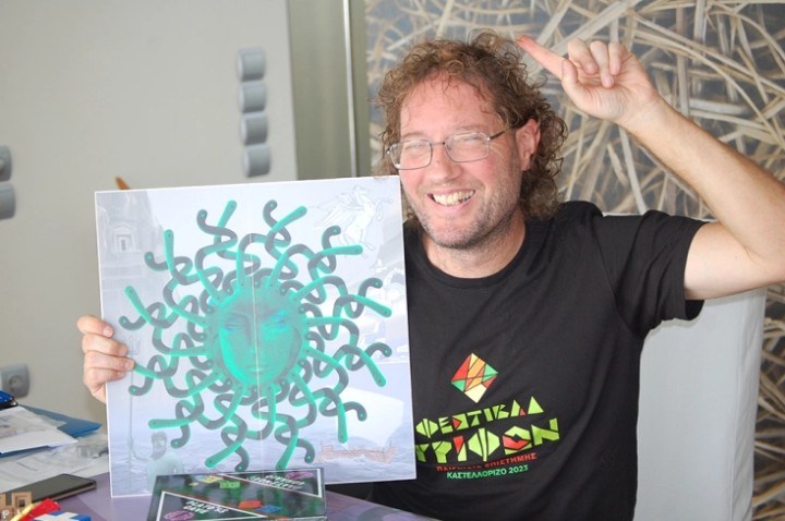 Μου δείχνει συνεχώς δημιουργίες του: «Έχω κάνει γρίφους που βασίζονται σε συμμετρία τεσσάρων διαστάσεων. Ο Καραγκιόζης είναι τοπολογικός γρίφος». Δείχνει τη Μέδουσα και μου λέει ότι, σύμφωνα με τον Στράβωνα, ζούσε στην αρχαία Μεγίστη - στο Καστελόριζο ζούσαν και οι Κύκλωπες, σημειώνει γελώντας.