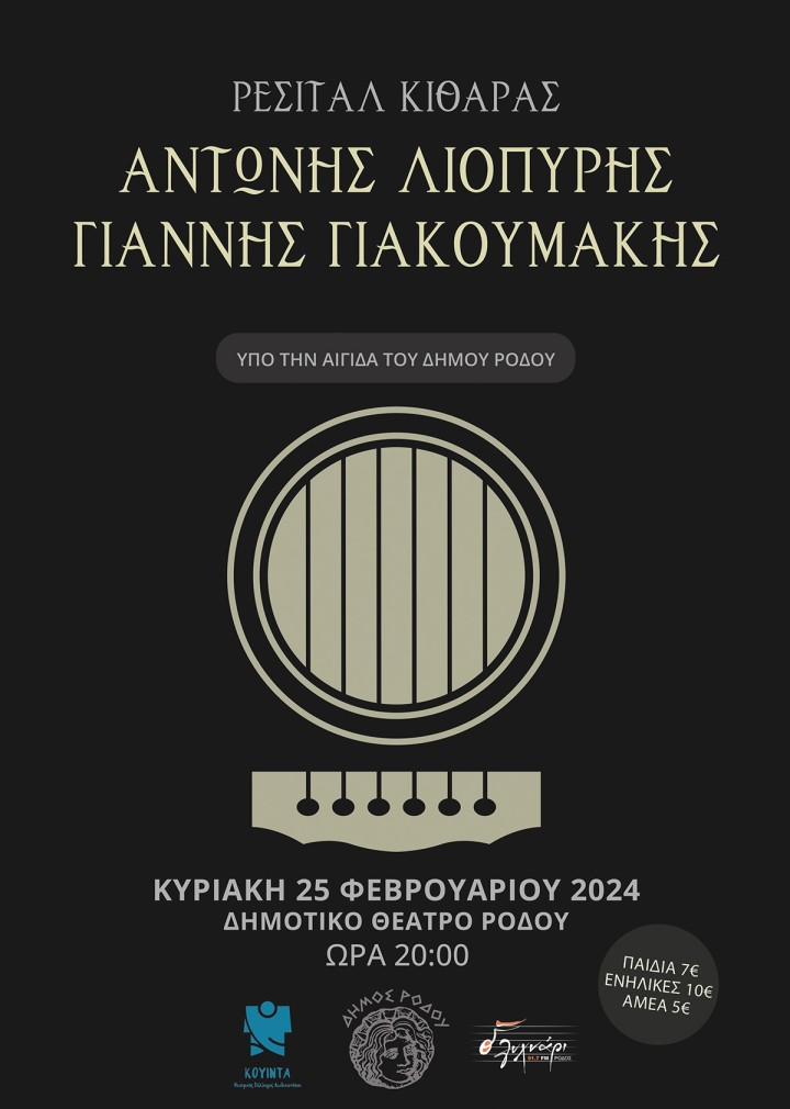 Την Κυριακή 25 Φεβρουαρίου και ώρα 20:00 στο Δημοτικό Θέατρο Ρόδου θα πραγματοποιηθεί ρεσιτάλ κιθάρας με τους Ρόδιους καλλιτέχνες Γιάννη Γιακουμάκη και Αντώνη Λιοπύρη.
