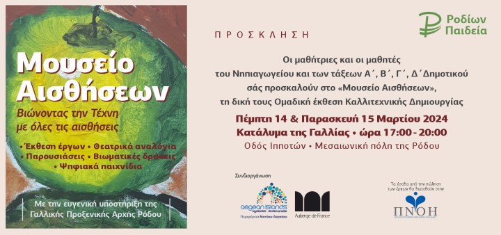 Οι μαθήτριες και οι μαθητές του Νηπιαγωγείου και των τάξεων Α’, Β’, Γ’ και Δ’ Δημοτικού των Εκπαιδευτηρίων «ΡΟΔΙΩΝ ΠΑΙΔΕΙΑ» σάς προκαλούν να περιηγηθείτε στο δικό τους πρωτότυπο «Μουσείο Αισθήσεων» , στο Κατάλυμα της Γαλλίας, Πέμπτη 14 και Παρασκευή 15 Μαρτίου 5 με 8 το απόγευμα.