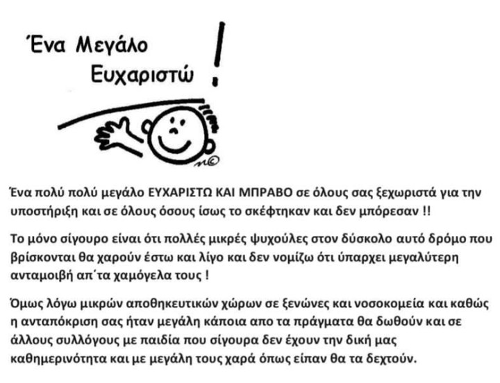 Την Τετάρτη 28 Μαρτίου, στάλθηκαν στην Αθήνα 32 κούτες με παιχνίδια, βιβλία για γονείς και παιδιά, είδη ζωγραφικής και παζλ. Από τις 32 κούτες, 3 θα δοθούν στον ξενώνα “Φλόγα”, 6 κούτες στον ξενώνα “Ελπίδα”, 5 κούτες στο νοσοκομείο Παίδων “Αγλαΐα Κυριακού”, 2 κούτες στο νοσοκομείο Παιδων “Αγία Σοφία” και από 8 κούτες στα παιδικά χωριά SOS και στο Χαμόγελο του Παιδιού, αντίστοιχα. Όπως δήλωσε η κ. Καλσάτου στο kosnews24, σημαντική ήταν η συμβολή και της μεταφορικής εταιρείας του κ. Σταμάτη Πη, που πραγματοποίησε δωρεάν τη μεταφορά, ενώ ακόμα ευχαρίστησε τους δωρητές αλλά και όλους όσοι συνέβαλαν στο να μαζευτούν τα παιχνίδια για τα παιδιά.