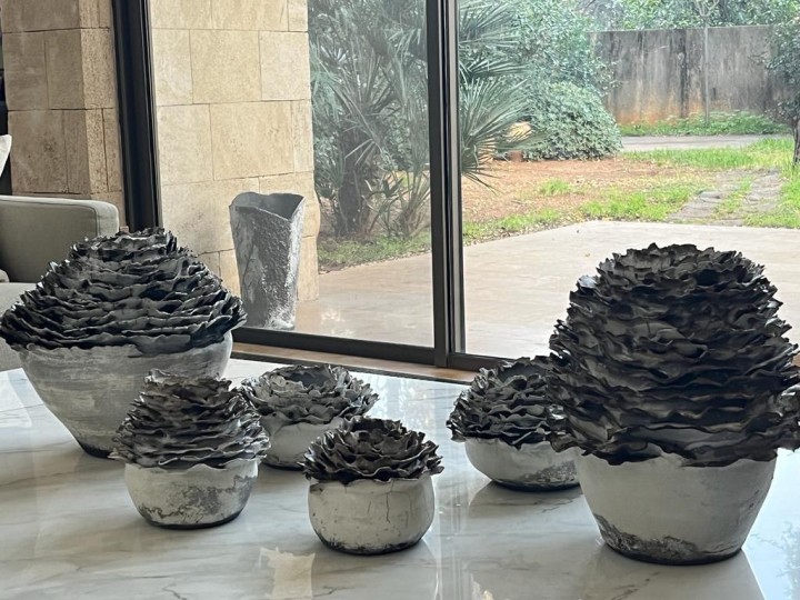 Ξεκίνησα κάνοντας κεραμικά "έπιπλα" για το σπίτι μου, κυρίως τραπέζια, φωτιστικά και μεγάλα βάζα με λουλουδένια σχέδια. Τώρα πλέον συνδημιουργώ με τους πελάτες μου τέτοια κομμάτια για τα σπίτια τους. Μου αρέσει να δουλεύω μεγάλα και αλλόκοτα.