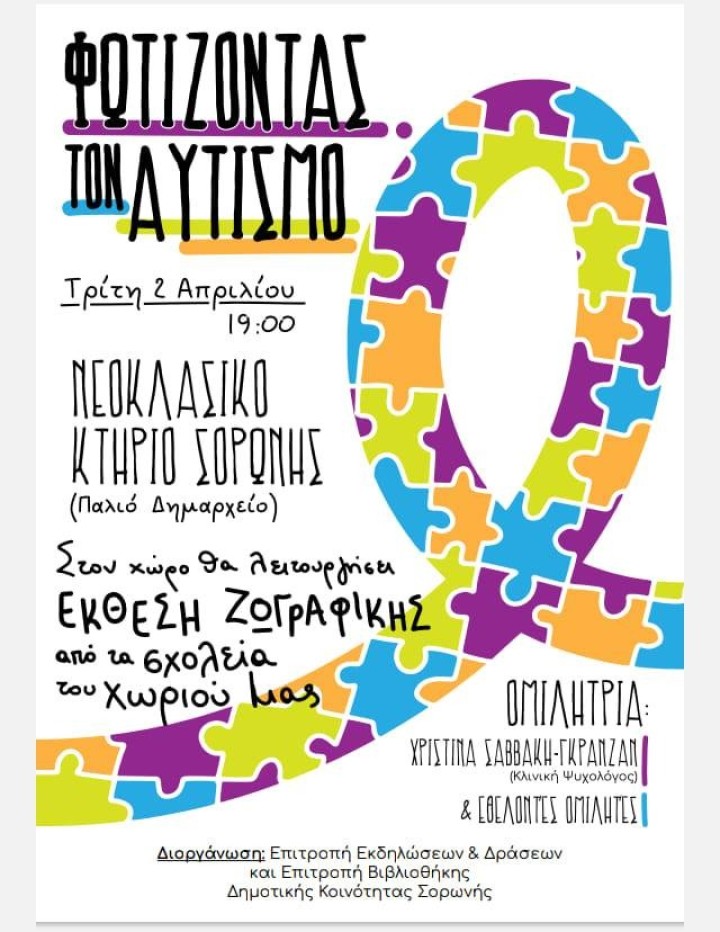 Την ερχόμενη Τρίτη 2 Απριλίου στις 7 το βράδυ στην κοινότητα Σορωνής θα πραγματοποιηθεί εκδήλωση με τίτλο «Φωτίζοντας τον αυτισμό».