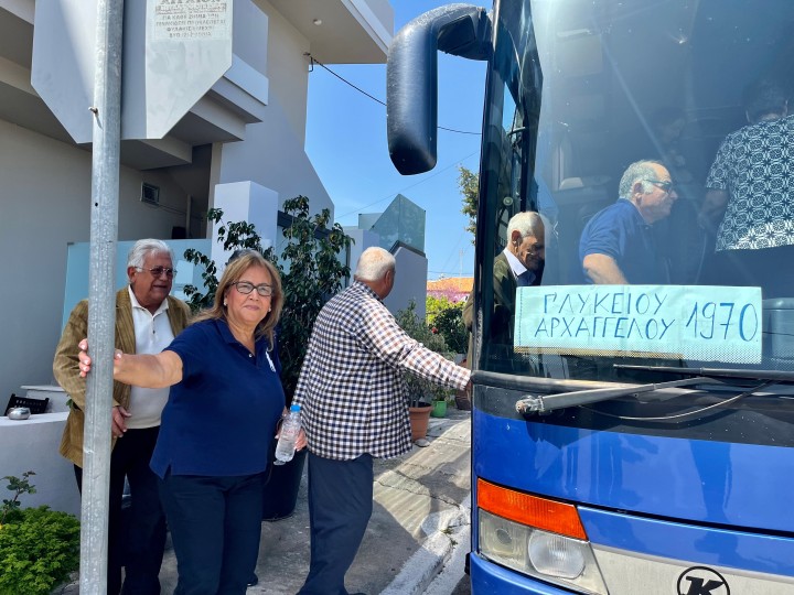 Πιο συγκεκριμένα, οι παλιοί συμμαθητές αλλά και οι συμμαθήτριες, με ορισμένες απουσίες της τελευταίας στιγμής, ξεκίνησαν με πούλμαν από το Σαν Φραγκίσκο και με στάσεις στο Φαληράκι, τ Αφάντου, τον Αρχάγγελο και ορισμένα ακόμα σημεία προκειμένου να παραλάβουν τους συμμαθητές, ήπιαν καφέ στην πλατεία Γενναδίου, έκαναν τη βόλτα τους στο Πρασονήσι και κατέληξαν σε ταβέρνα στην Κατταβιά, όπου και χόρεψαν και τραγούδησαν με την ψυχή τους.