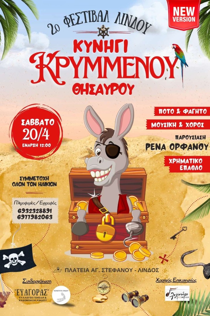 Το Σάββατο 20 Απριλίου στις 12.00 το μεσημέρι στην πλατεία Αγίου Στεφάνου Λίνδου, θα διεξαχθεί για 2η συνεχόμενη χρονιά το κυνήγι κρυμμένου θησαυρού για παιδιά και ενήλικες.