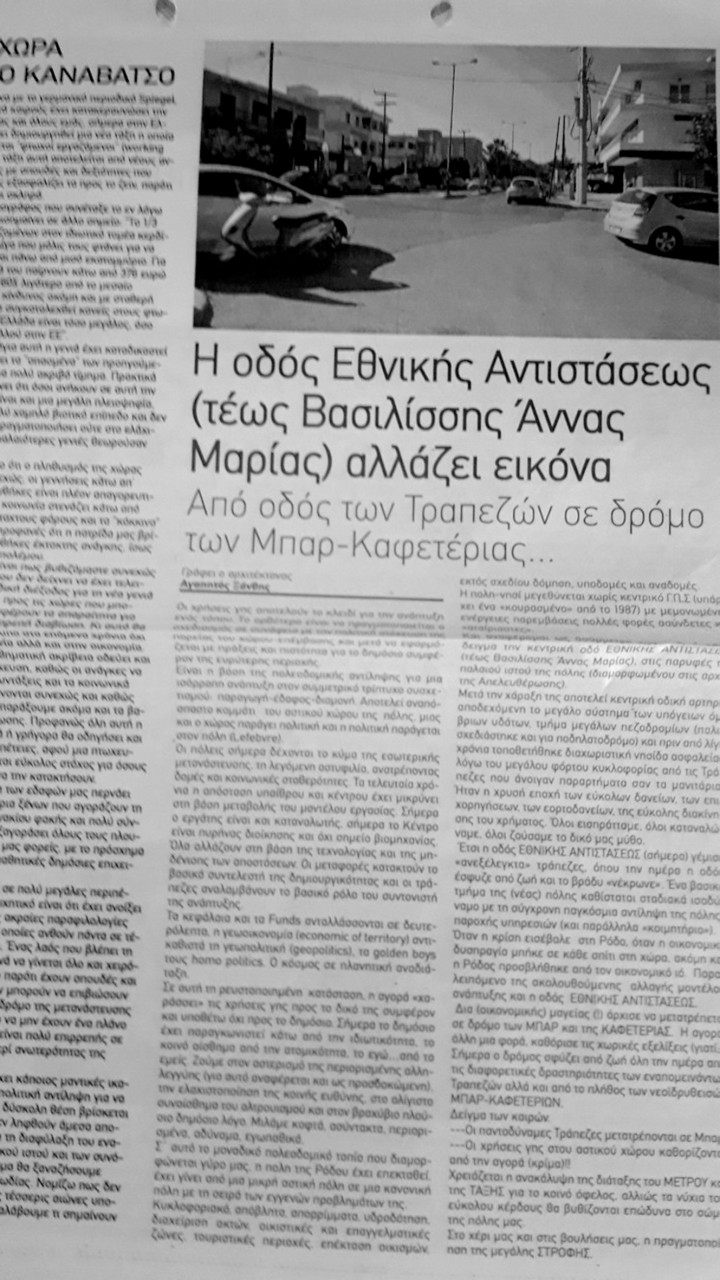 Σε άρθρο μου στη φιλόξενη «ΡΟΔΙΑΚΗ» με τίτλο: «Η οδός Εθνικής Αντιστάσεως» (τέως Βασιλίσσης Άννας) και με υπότιτλο: «Από οδός Τραπεζών σε δρόμο των Μπαρ-Καφετέριας», στις 5/11/2017 είχα επισημάνει την ασύμμετρη αλλαγή χρήσης γης, την πύκνωση της τότε κυκλοφορίας των οχημάτων, την εκδίωξη των πεζών, την κατάληψη του μεγάλου πεζοδρομίου από τα αυτοκίνητα για μια θέση στάθμευσης και τέλος τη βύθιση των κανόνων της πολεοδομίας περί «καθολικού σχεδιασμού» της πόλης [βλ. Αραβαντινός, Α. (2007). Πολεοδομικός σχεδιασμός. Αθήνα: Συμμετρία, σσ. 57,83).