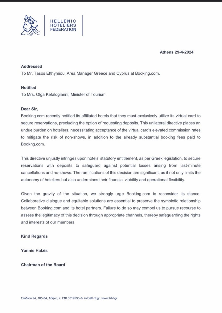 «Η Booking.com πρόσφατα κοινοποίησε στα συνεργαζόμενα με αυτήν ξενοδοχεία, ότι αυτοί θα πρέπει αποκλειστικά ν’ αξιοποιούν μία εικονική τους κάρτα για να εξασφαλίσουν και να επιβεβαιώσουν τις κρατήσεις τους, αποκλείοντας την εκδοχή των απαιτούμενων καταθέσεων. Αυτή η μονομερής οδηγία επιβαρύνει αδικαιολόγητα τους ξενοδόχους, αφού απαιτούν την αποδοχή των αυξημένων ποσοστών προμήθειας των εικονικών αυτών καρτών, ώστε να περιορίσουν το ρίσκο των non-show πελατών. Αυτό το ποσοστό προμήθειας της εικονικής κάρτας έρχεται να προστεθεί στους ήδη υπάρχοντες ουσιώδεις φόρους, που καταβάλλονται στην Booking.com.