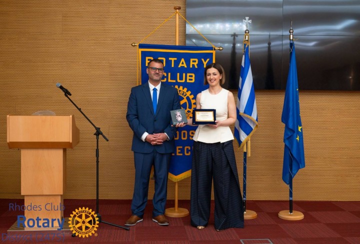 «Σας ευχαριστούμε πολύ για την τόσο ενδιαφέρουσα ομιλία σας. Επιτρέψτε μου να σας απονείμω εκ μέρους του Ομίλου μας την αναμνηστική αυτή πλακέτα αναγνωρίζοντας την μέχρι σήμερα μοναδική σας πορεία» τόνισε μετά το πέρας της συζήτησης ο πρόεδρος του Ροταριανού Ομίλου Ρόδου κ. Χαλικιάς.
