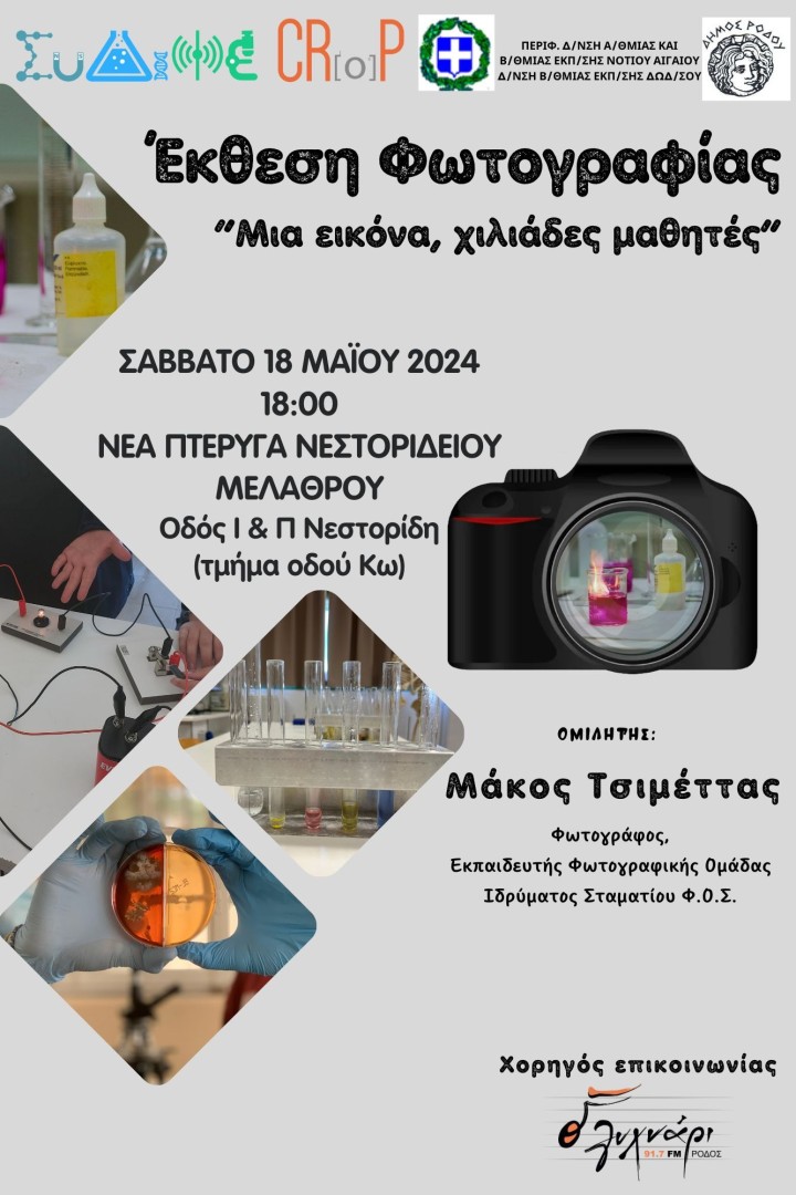 Ο Σύλλογος για τη Διάδοση των Φυσικών Επιστημών (Συ.Δι.Φ.Ε.) σε συνεργασία με τη Λέσχη Ερασιτεχνών Φωτογράφων Ρόδου (C.Ro.P), τη Διεύθυνση Δευτεροβάθμιας Εκπαίδευσης Δωδεκανήσου, την Περιφερειακή Διεύθυνση Εκπαίδευσης Νοτίου Αιγαίου και τη Διεύθυνση Παιδείας, Πολιτισμού & Αθλητισμού, Τμήμα Παιδείας & Δια Βίου Μάθησης του δήμου Ρόδου, συνδιοργανώνουν Έκθεση Μαθητικής Φωτογραφίας με τίτλο: