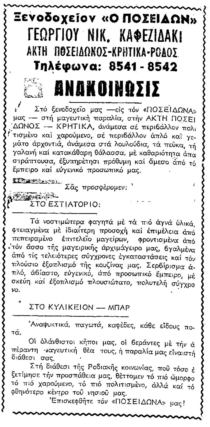 Δι’ εγκυκλίου του μακαρονοποιείου Σουλούνια Ρόδου προς διάφορα καταστήματα εγνωστοποιήθη ότι από της 15ης Μαΐου 1964 και πέραν αι τιμαί των ζυμαρικών εκ συμιγδαλίου παραγωγής του εν λόγω εργοστασίου αυξάνονται από 7.70 δραχμάς το εκ χάρτου δέμα (μονόκλινο) εις 9.30 δραχμάς χονδρικώς και από 8.40 δρχ. εις 10.20 δρχ. λιανικώς.