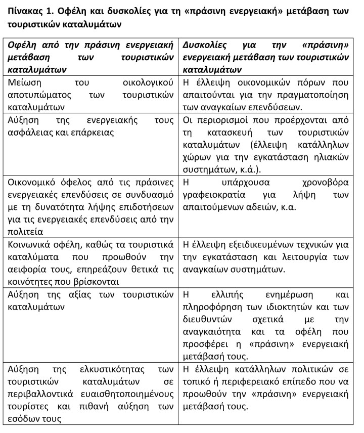 Στις συνθήκες αυτές της κλιματικής κρίσης και της πιθανής μείωσης της ελκυστικότητας διαφόρων, δημοφιλών μέχρι σήμερα, τουριστικών προορισμών της χώρας η «πράσινη» ενεργειακή μετάβαση των τουριστικών καταλυμάτων είναι περισσότερο επιβεβλημένη παρά ποτέ. Εφόσον αυτά είναι πολύ πιθανόν να επηρεαστούν σημαντικά από την κλιματική κρίση, θα πρέπει να αφενός να συμβάλουν στον μετριασμό της κλιματικής αλλαγής και αφετέρου να προσαρμοσθούν στις νέες συνθήκες λαμβάνοντας τα απαραίτητα μέτρα αποφυγής δυσάρεστων συμβάντων.
